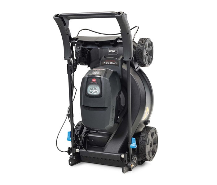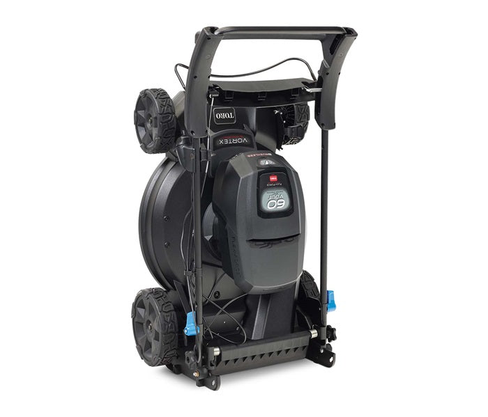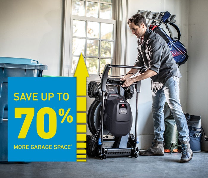 *Battery manufacturer rating = 60V maximum & 54V typical usage. Actual voltage varies with load. **Space savings are in relation to the space consumed by a Toro 22 in. walk power mower that is stored with the handle in the standard operating position. |